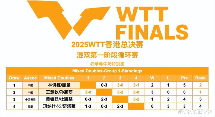 A组第一阶段的比拼,王楚钦/孙颖莎三连胜小组第一晋级,林诗栋/蒯曼是2胜1负小组第二晋级。