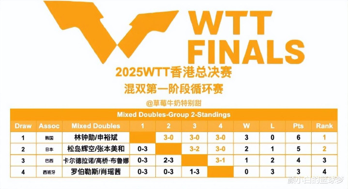 B组的比拼,林钟勋/申裕斌是3连胜小组第一晋级,张本美和/松岛辉空是2胜1负小组第二晋级。