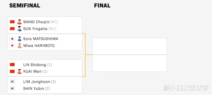 混双半决赛的对阵图:王楚钦/孙颖莎VS张本美和/松岛辉空、林钟勋/申裕斌VS林诗栋/蒯曼,国乒有希望在决赛中碰面。